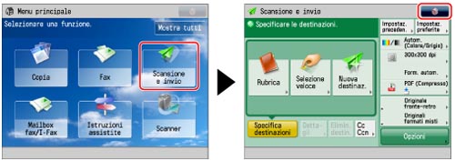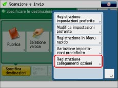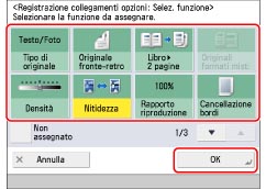Sulla schermata Scansione e invio vengono visualizzate due opzioni di selezioni veloci. [Originale fronte-retro] e [Originali formati misti] vengono visualizzati come predefiniti. Queste selezioni veloci possono essere modificate nelle funzioni più utilizzate.