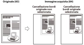 Quando si attiva questo modo, vengono cancellati i bordi scuri e le linee di contorno che altrimenti apparirebbero eseguendo la scansione di originali di formato più piccolo del formato carta specificato. Questo modo può anche essere usato per creare una cornice vuota intorno all'immagine scansionata.