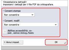 Le impostazioni per i file PDF protetti possono essere registrate in un pulsante Impostazioni preferite. Se non si vuole impostare una password per [Password apertura docum.] e [Password autorizzaz.] per un pulsante Impostazioni preferite, lasciare vuoto il campo della password.