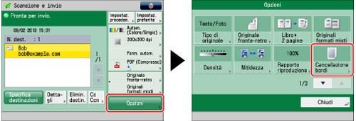 Specificare la destinazione → selezionare [Opzioni] → [Cancellazione bordi].