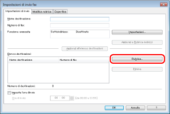 Se [Prima di aggiungere la destinazione in [Elenco destinazioni] inserire il n. de fax] è selezionato nella finestra di dialogo [Impostaz.protezione] della scheda [Speciale], selezionando [Aggiungi all'elenco destinazioni] viene visualizzata la finestra di dialogo [Conferma password]. Per informazioni dettagliate, vedere la Guida in linea. (Vedere "Visualizzazione della Guida in linea.")