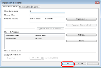 È possibile memorizzare fino a 512 destinatari di trasmissioni fax nella macchina. Se il numero di destinatari è superiore a 512, dopo l'invio di un fax alla periferica, l'ultimo fax in ingresso verrà cancellato. Prestare attenzione quando si registrano più di 512 destinatari in gruppi o quando si invia ripetutamente un fax a più gruppi.