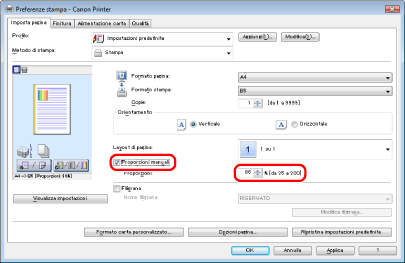 Per aumentare o diminuire manualmente l'ingrandimento, selezionare [Proporzioni manuali] → specificare il valore percentuale delle proporzioni per [Proporzioni].