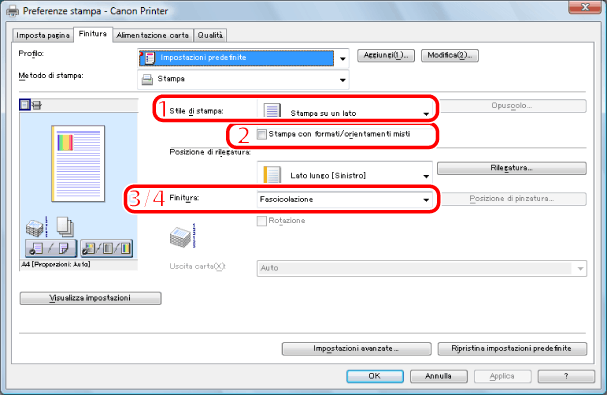 Quando vengono stampate pagine con dimensioni e/o orientamenti misti, allinea la posizione di rilegatura.