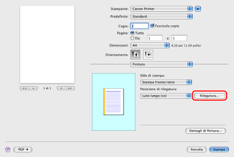 L'impostazione predefinita per [Stile di stampa] è [Stampa fronte/retro]. È anche possibile registrare [Stampa su un lato] come impostazione predefinita. Per istruzioni su come configurare le impostazioni predefinite, vedere "Utilizzo di [Predefinite] per la stampa".