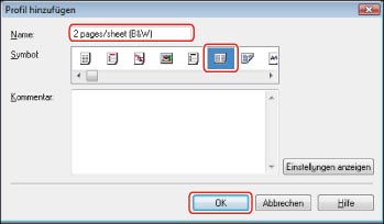 Geben Sie '2 pages/sheet (B&W)' unter [Name] ein → Wählen Sie