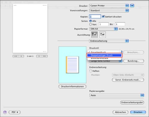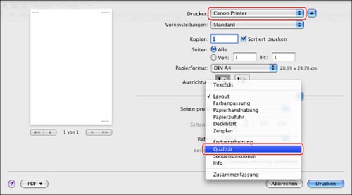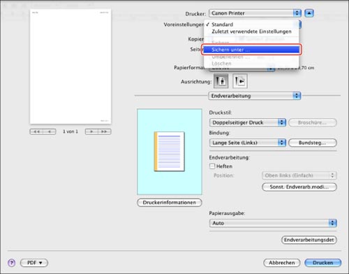 Sie können die auf den einzelnen Registerkarten des Mac Print Dialogs festgelegten Einstellungen als Voreinstellungen speichern. Eine Voreinstellung ist eine Kombination häufig verwendeter Druckfunktionen, die als eine einzelne Einstellung gespeichert werden. Sie können Druckeinstellung entsprechend Ihres Bedarfs ganz einfach durch Auswahl einer vorher gespeicherten Voreinstellung festlegen.