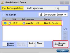 Von anderen Anwendern gesendete geschützte Druckaufträge und verschlüsselte, geschützte Druckaufträge werden in Form von Sternchen ("*********") angezeigt. Auf sie kann nicht zugegriffen werden.