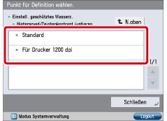 In der Grundeinstellung wird [Weiße Buchstaben auf farb. Hintergr.] auf dem Display <Einstellungen Druck> für das Erstellen von Musterdrucken nicht ausgewählt. Wenn [Weiße Buchstaben auf farb. Hintergr.] aktiviert ist, regeln Sie mit [Einstellungen Standardwert] die Dichte des Texts und mit [Latente Bereichsdichte] die Dichte des Hintergrunds.