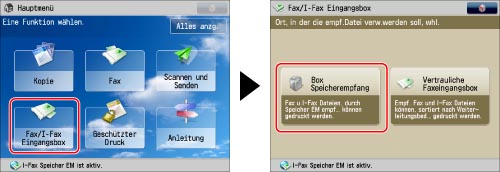 Wenn Sie <Fax Speicherempfang> und/oder <I-Fax Speicherempfang> deaktivieren, werden Dokumente, die per Fax/I-Fax empfangen wurden, automatisch gedruckt und in der Speichereingangsbox gelöscht.