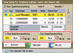 Wenn Sie Anfangs- und Endzeiten für den Speicherempfang definiert haben, wird die Uhrzeit für die automatische Deaktivierung des Speicherempfangs angezeigt, wenn Sie <Fax Speicherempfang> und/oder <I-Fax Speicherempfang> aktivieren. Entsprechend wird die Uhrzeit der automatischen Aktivierung des Speicherempfangs angezeigt, wenn Sie den Speicherempfang deaktivieren.