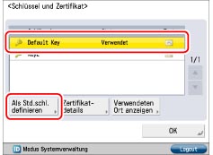 Sie können prüfen, wofür ein Schlüsselpaar verwendet wird, indem Sie auf dem Display <Schlüssel und Zertifikat> ein Schlüsselpaar mit 'Verwendet' unter <Verwendet> auswählen und die Taste [Verwendeten Ort anzeigen] berühren.