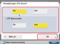 Berühren Sie die Taste [Einstellungen LPD-Druck] für [Einstellungen TCP/IP] → Legen Sie die folgenden Optionen fest → Bestätigen Sie durch Berühren der Taste [OK].
