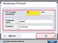 Berühren Sie die Taste [Einstellungen FTP-Druck] für [Einstellungen TCP/IP] → Legen Sie die folgenden Optionen fest → Bestätigen Sie durch Berühren der Taste [OK].