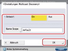 Berühren Sie [Ein] für <Antwort>, um Geräteinformationen von anderen Systemen zu verwenden, wie z. B. ein Adressbuch oder Einstellungen zur Verwaltung per Abteilungs ID, oder auf ein Multicast-Discovery mit Werkzeugen antworten.