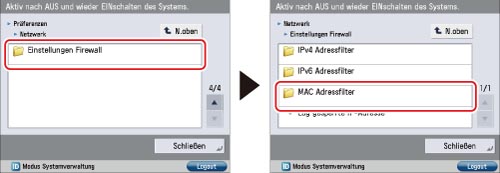 Berühren Sie [Einstellungen Firewall] für [Netzwerk] → Berühren Sie [MAC Adressfilter].