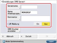 Berühren Sie [Aus] für <SMB Server verwenden>, wenn Sie keinen SMB-Server verwenden möchten.
