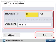 Berühren Sie [SMB Drucker einstellen] → Geben Sie die Einstellungen für den SMB-Drucker ein → Bestätigen Sie durch Berühren der Taste [OK].