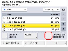 Sie können einen Papiertyp speichern, der nicht in den Einstellungen für das Mehrzweckfach unter [Detail. Einstell.] aufgelistet ist. Vgl. Abschnitt "Speichern/Bearbeiten anwenderdefinierter Papiertypen".