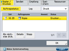 Wenn Sie [Kopieren/Drucken], [Auftragsstatus], [Druck] für <Standardanzeige (Status Monitor/Abbruch)> einstellen: