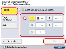Sie können die Startzeit für den Speicherempfang mit [Täglich] und den Endzeitpunkt mit [Tage definieren] festlegen oder umgekehrt.