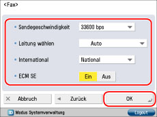 Wenn Sie die Faxfunktion mit dem Remote Fax Kit verwenden, werden für <ECM SE>, <Sendegeschwindigkeit> und <International> beim Senden die Einstellungen des Remote Faxservers verwendet.
