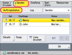 Berühren Sie nacheinander die Tasten [Senden] → [Auftragsstatus].