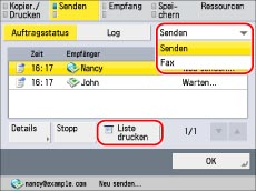 In der Liste der Sendeaufträge wird eine Liste der Fax-, E-Mail-, I-Fax- und Dateiserverübertragungen gedruckt.