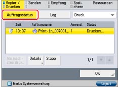 Berühren Sie nacheinander die Tasten [Kopier./Drucken] → [Auftragsstatus].