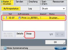 Wählen Sie den Auftrag → Berühren Sie die Taste [Stopp].
