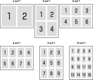 Sie können mehrere Seiten mit PDF-Daten gemeinsam auf einem Blatt Papier ausgeben. Die Seiten werden in der Reihenfolge von (oben) links nach rechts gedruckt.