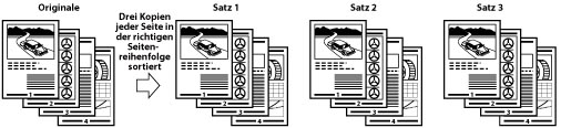 Wenn Sie mehrere Kopien eines Originals drucken, können Sie die Ausgabe in getrennte Kopien sortieren.