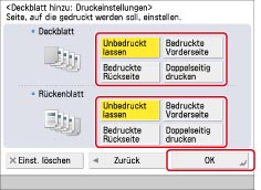Mit dieser Funktion können Sie das System so einstellen, dass automatisch Deck- und Rückenblätter eingefügt werden. Sie können einen anderen als den für das Hauptdokument verwendeten Papiertyp auswählen. Sie können auch festlegen, ob auf die Deck- und Rückenblätter kopiert werden soll.