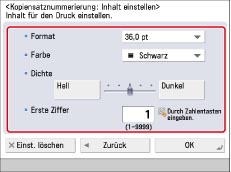 Wenn Sie [Einstell. Option Kopiensatznummerierung] in <Einstellungen Funktion> (<Einstellungen/Speicherung>) aktivieren, können Sie das Format der Kopiersatznummern auf [10.5 pt], [12.0 pt] oder [14.0 pt] festlegen. (Vgl. Abschnitt "Optionen zur Kopiensatznummerierung".)