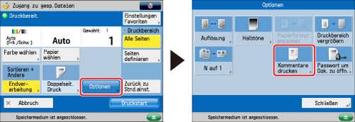 Berühren Sie nacheinander die Tasten [Optionen] → [Kommentare drucken].