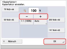 Um den Faktor auf 100 % zurückzusetzen, berühren Sie die Taste [1:1(100%)].
