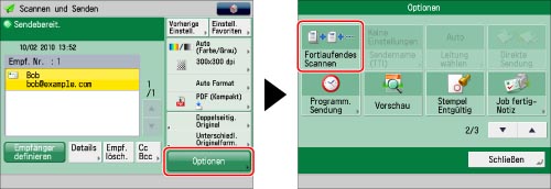 Bei einem Vorgang können maximal 999 Seiten gesendet werden. Wenn Sie in der Funktion <Fortlaufendes Scannen> mehr als 999 Seiten eingescannt haben, werden Sie in einer Meldung gefragt, ob der Job gesendet werden soll. Bei Auswahl von 'Ja' werden die bisher eingescannten 999 Seiten gesendet. Bei Abbruch werden die eingescannten Seiten nicht gesendet.