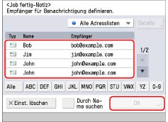 Wählen Sie den Empfänger für die Job fertig-Notiz → Berühren Sie nacheinander die Tasten [OK] → [Schließen].