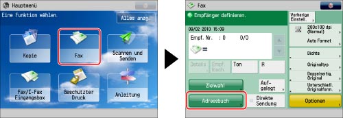 Berühren Sie nacheinander die Tasten [Fax] → [Adressbuch].