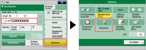 Geben Sie die Empfänger an → Berühren Sie nacheinander die Tasten [Optionen] → [Vorschau].