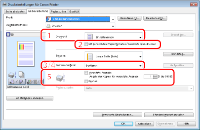 Bedruckt eine oder beide Seiten des Blattes. Die Standardeinstellung für [Druckstil] ist [Doppelseitiger Druck] (vgl. "Einseitendruck/Doppelseitiger Druck").
