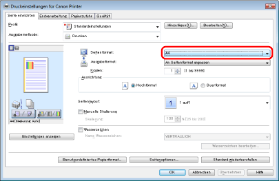 Wählen Sie das Papierformat des in der Anwendung erstellten Dokuments unter [Seitenformat].
