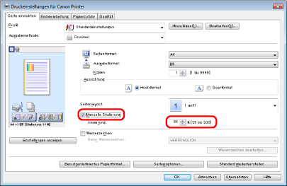 Wenn Sie die Vergrößerung manuell erhöhen oder verringern möchten, wählen Sie [Manuelle Skalierung] → Legen Sie das Skalierungsverhältnis für [Skalierung] fest.