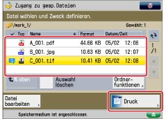 Wählen Sie die zu druckende Datei → Berühren Sie die Taste [Druck].
