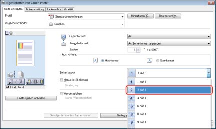 Klicken Sie auf der Registerkarte [Seite einrichten] auf die Auswahlliste für <Seitenlayout> → Wählen Sie [2 auf 1].