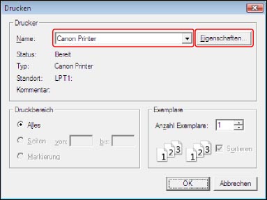Klicken Sie im Dialogfeld [Drucken] auf [Eigenschaften].