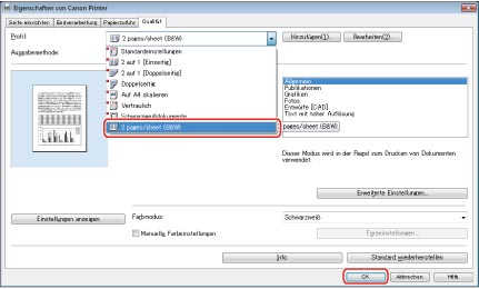 Berühren Sie die Auswahlliste <Profil> → Wählen Sie [2 pages/sheet (B&W)] → Klicken Sie auf [OK].