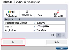 Wurde beim Speichern der Taste im Expressmenü die Option <Bestätigungsanzeige bei Rückruf anzeigen> deaktiviert, wird vor der Auftragsverarbeitung kein Display zur Überprüfung der gespeicherten Einstellungen angezeigt. (Vgl. Abschnitt "Speichern von persönlichen/gemeinsamen Tasten".)