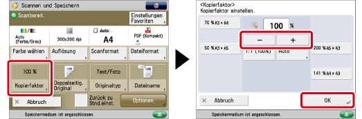 betätigen.Um den Zoomfaktor auf 100 % festzulegen, berühren Sie die Taste [1:1 (100%)].