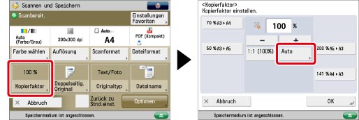 Sie können die Funktion <Auto Zoom> auf dem Display <Zoomfaktor> nur wählen, wenn Sie eine Auflösung von 300 x 300 dpi oder 600 x 600 dpi festgelegt haben.